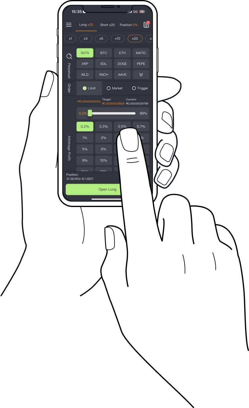In the Bitrader main interface, navigate to the USDT-based perpetual contract list (currently supporting only OKX USDT-based perpetual contract pairs). Select the desired USDT-based contract pair for trading. If the desired pair is not displayed, you can search for it by clicking the search button on the left.